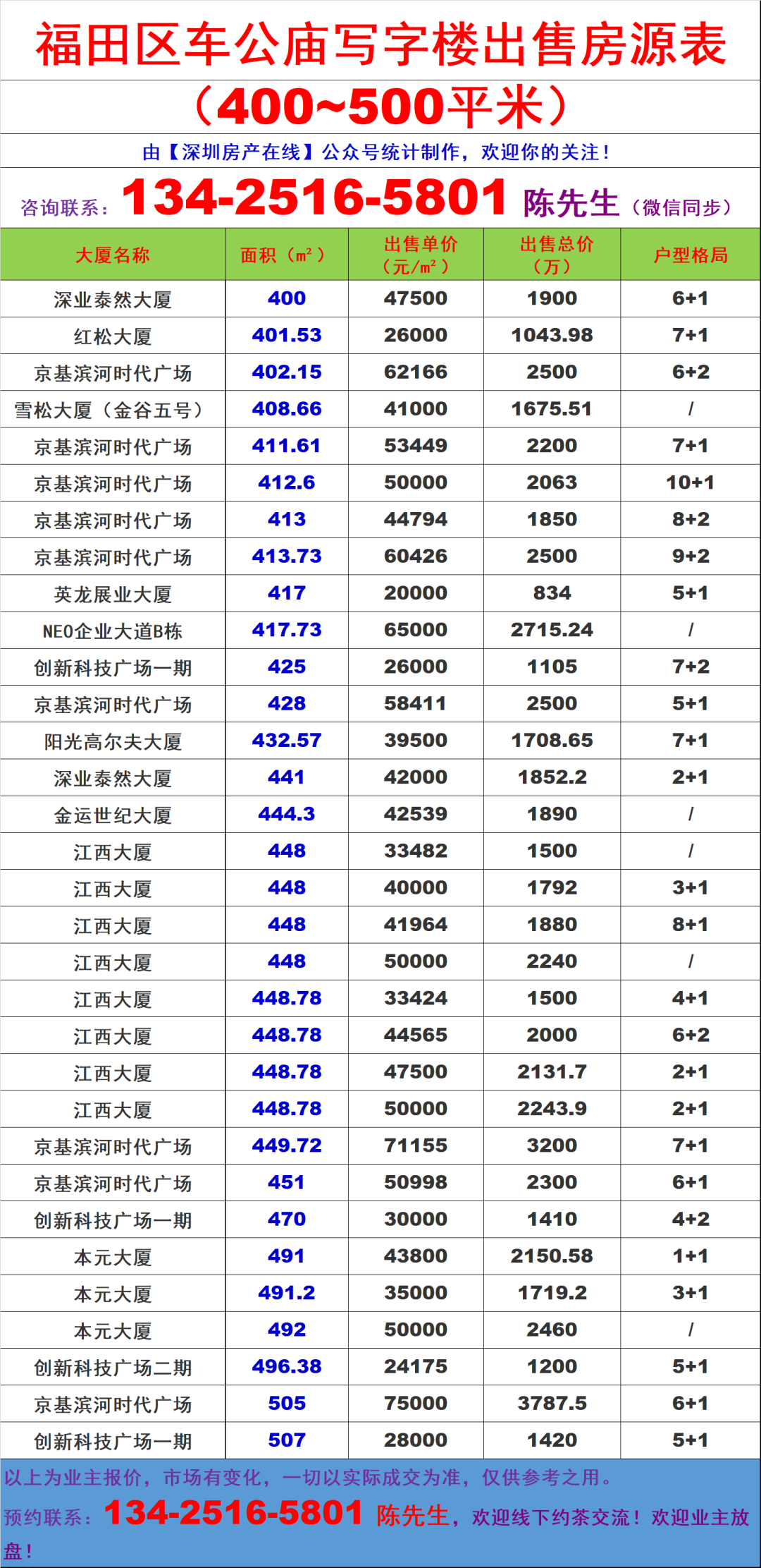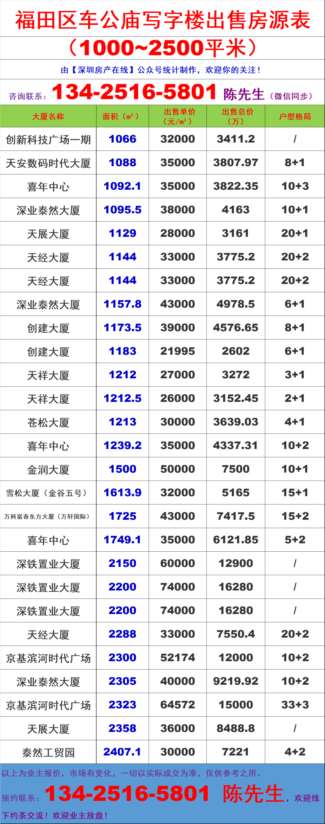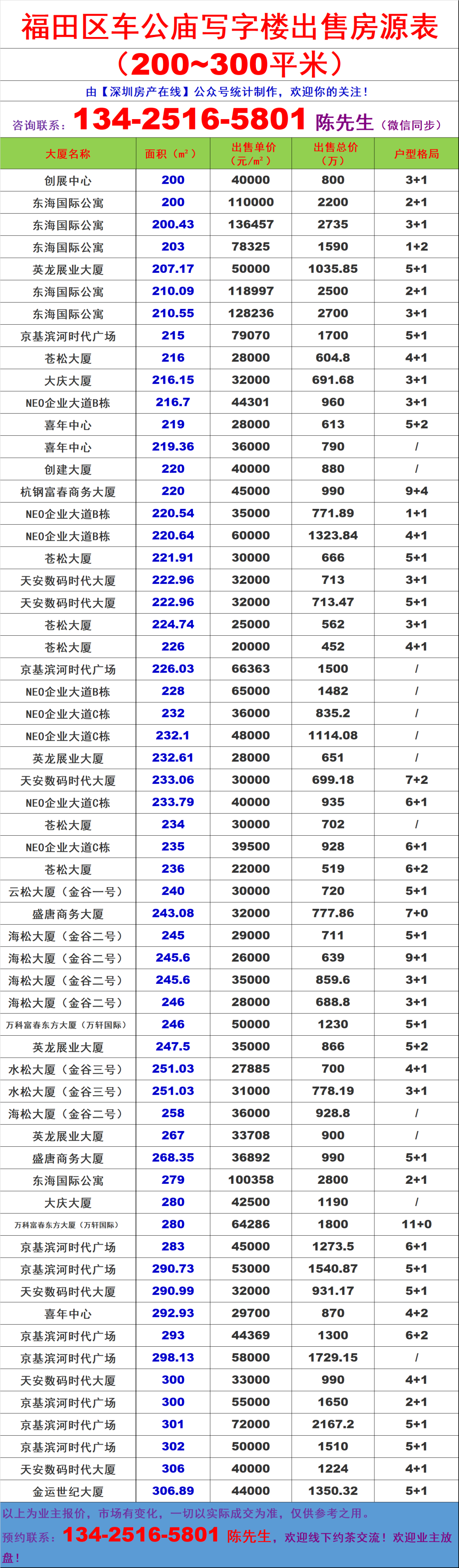 深圳福田区车公庙写字楼办公室出售买卖房源信息表&出售价格表