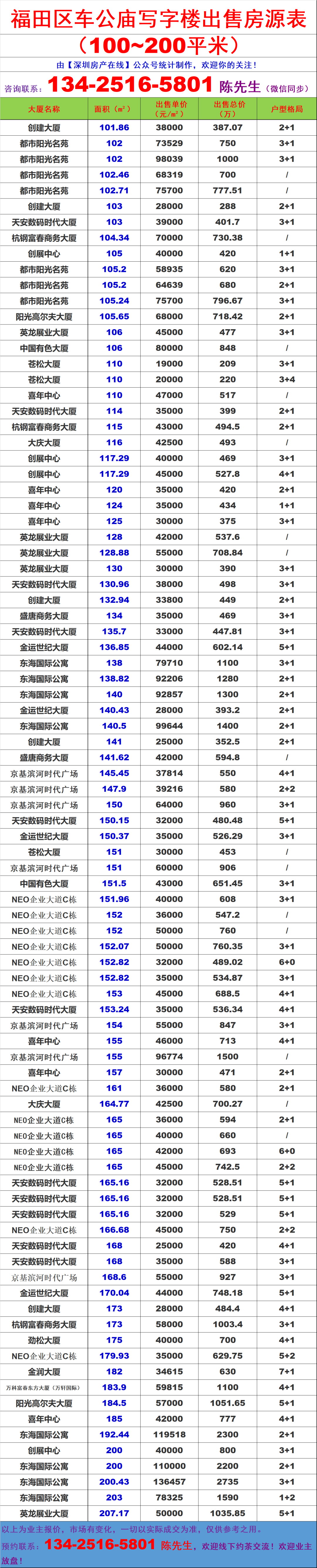 福田区车公庙片区写字楼办公室出售买卖房源信息表&出售价格表