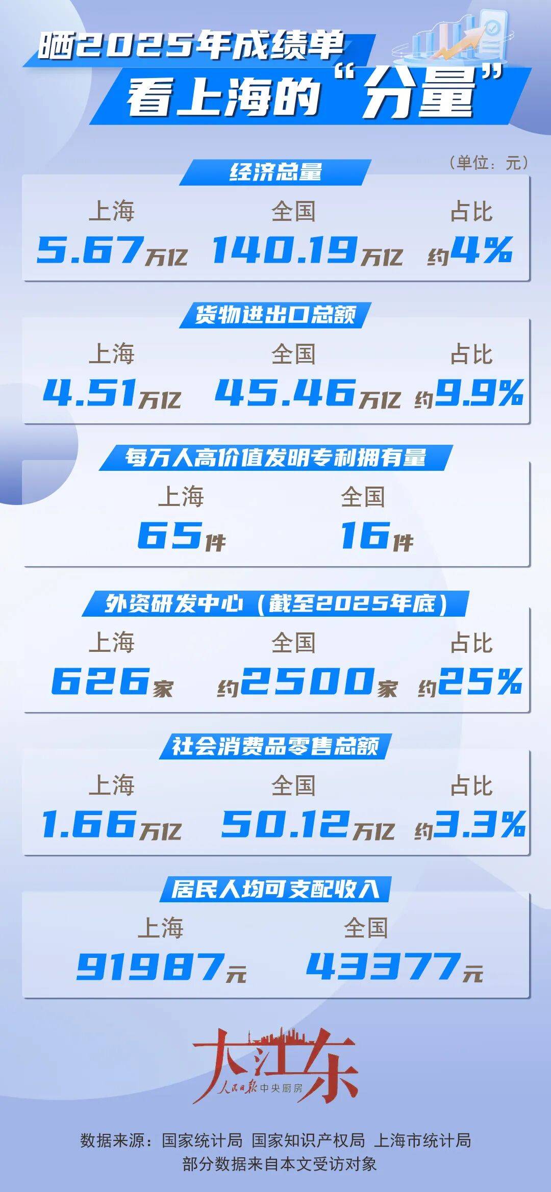 上海,从2021年GDP总量站上4万亿元,到成为全国首个5万亿之城,再到2025年全市生产总值增长5.4%左右,高于全国平均增速0.4个百分点……