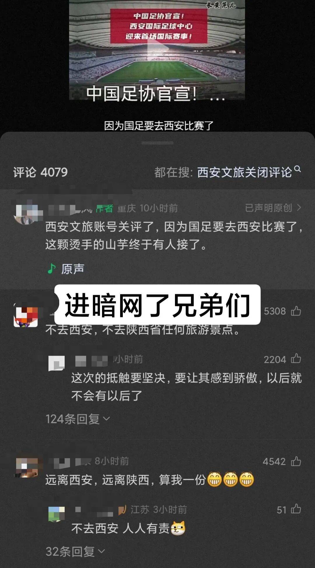 于是,西安被贴上了一个非常微妙的标签“怎么什么脏活都接?”互联网上大量“黑子”涌入评论区嘲讽西安,抵制西安。甚至出现了“ 再不去西安旅游了,西安就是足协接盘侠”的抵制贴。
