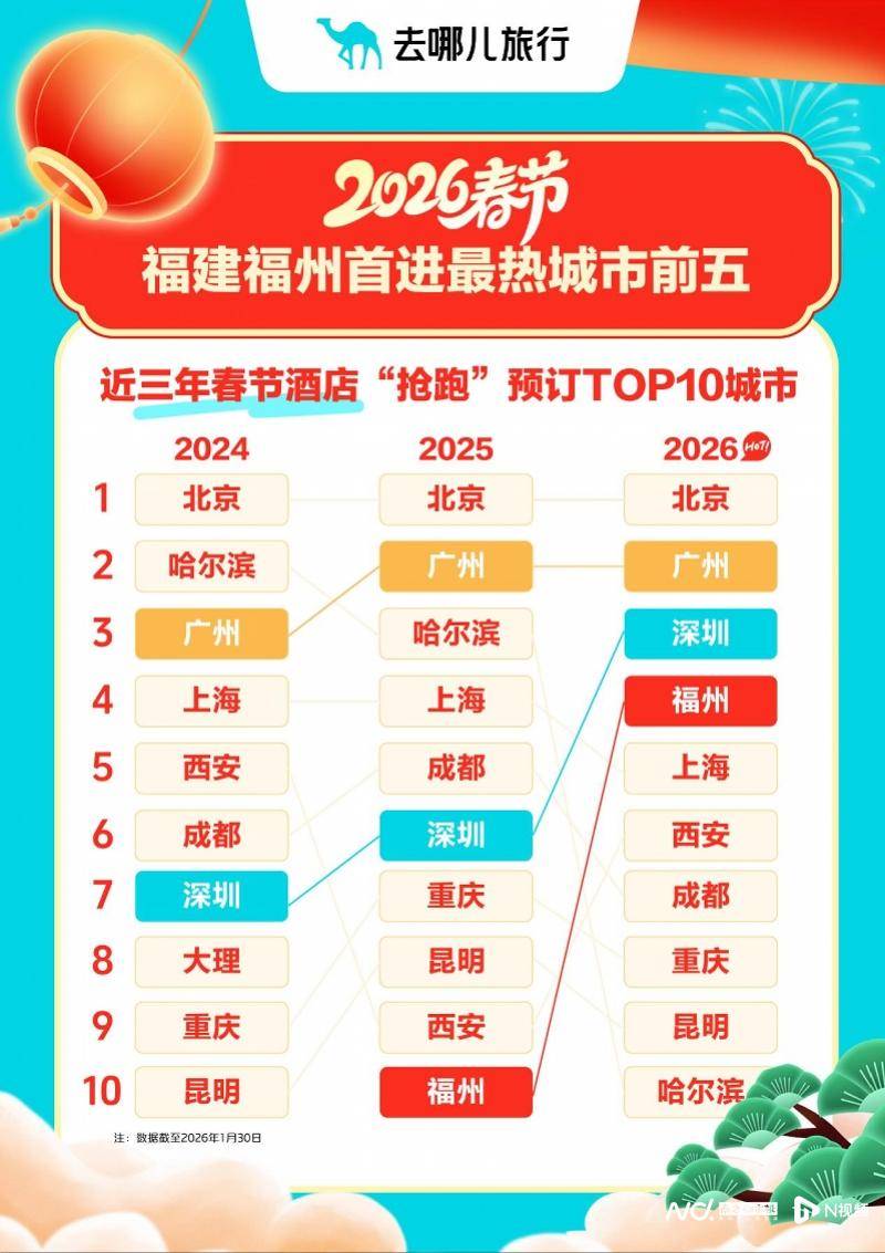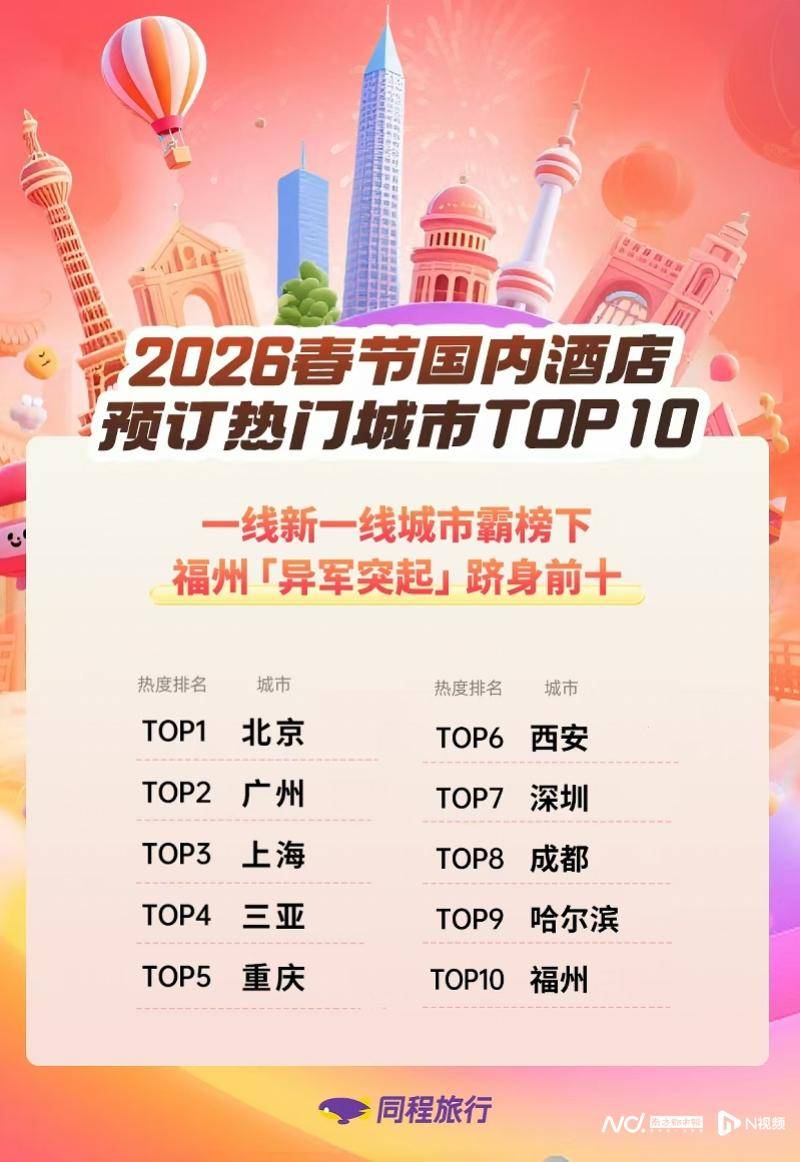 虽然目前距春节尚有10余天,一些旅客已经“抢跑”订好酒店。截至2026年1月30日,春节期间酒店提前预订量最高的城市分别是:北京、广州、深圳、福州、上海、西安、成都、重庆、昆明、哈尔滨。