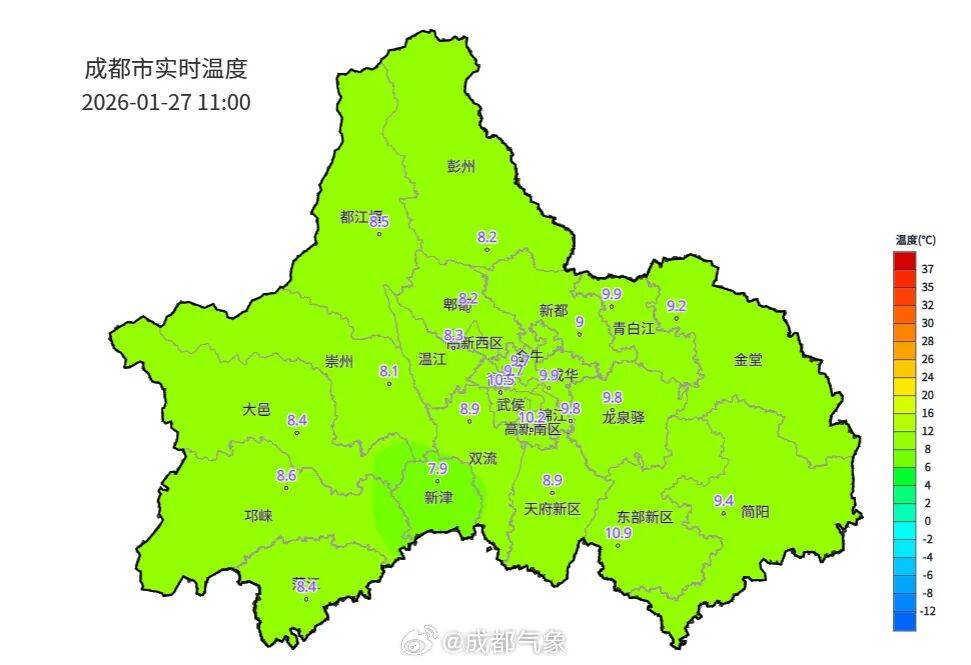 成都将有一次弱冷空气影响造成的弱降温降雨天气,日最高气温仅有9℃。