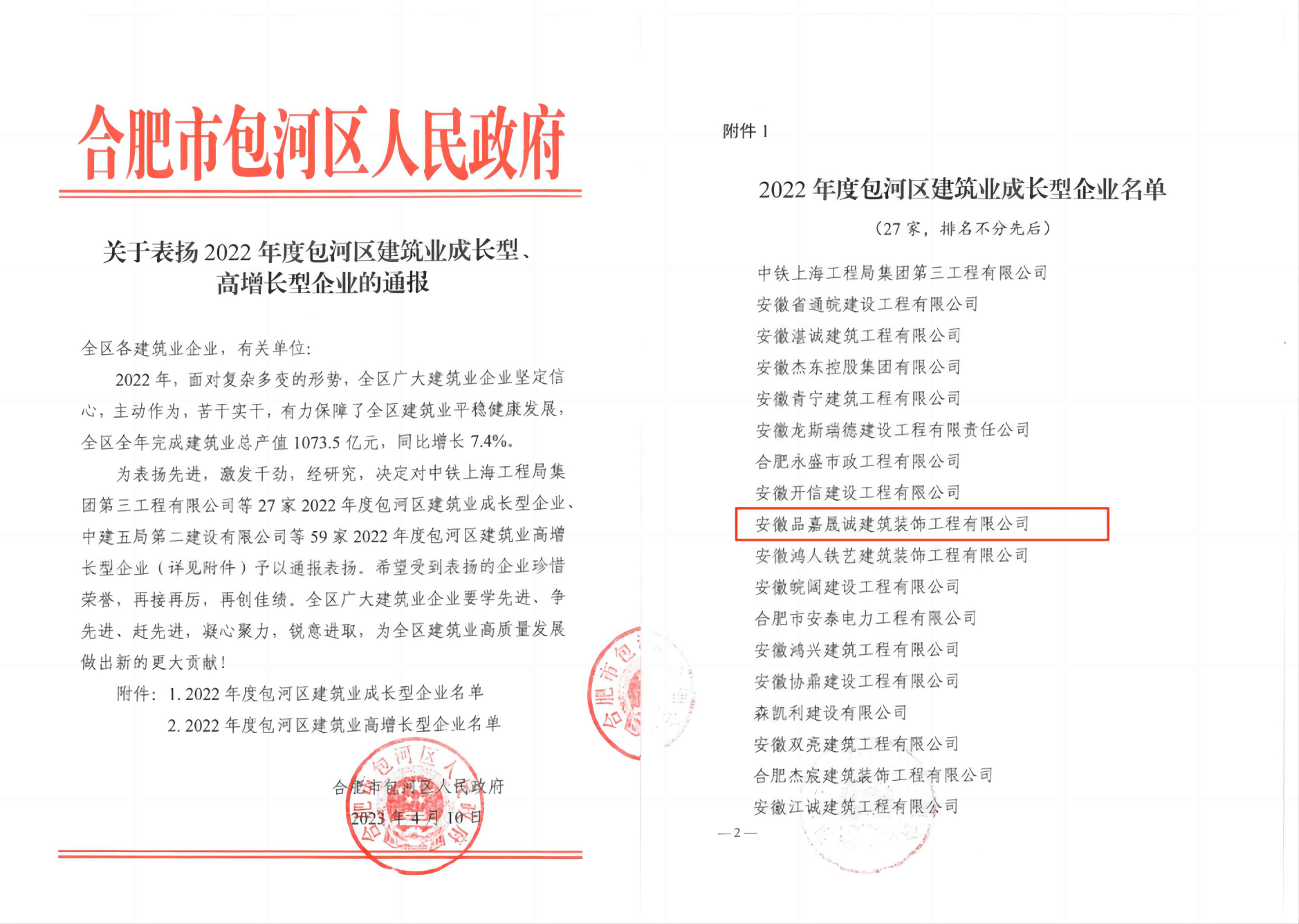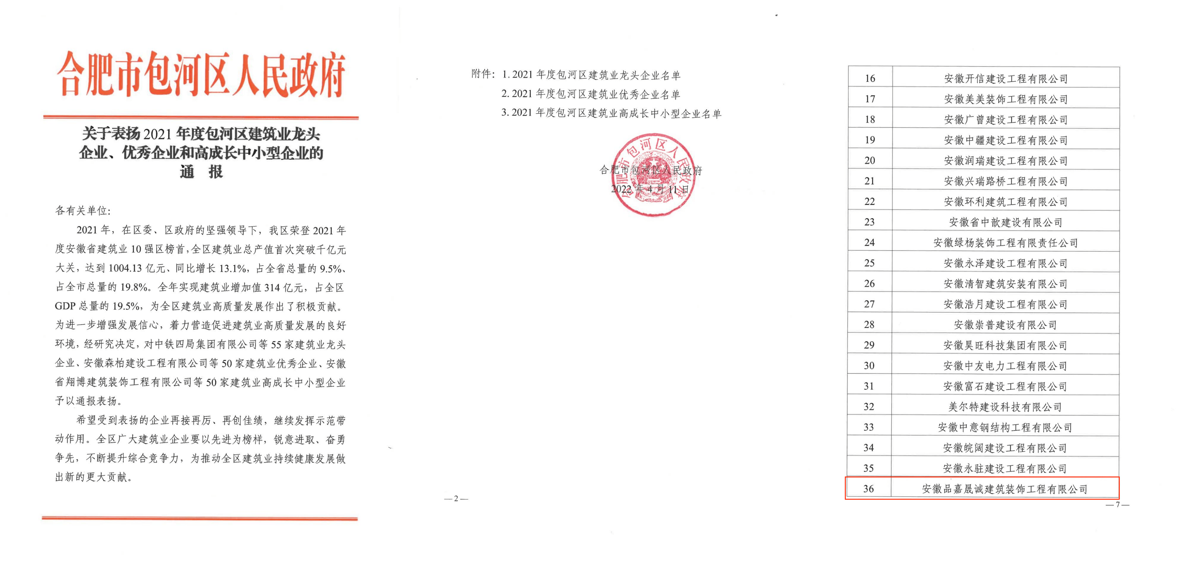 主要经营自建办公楼装修设计施工、商业厂房办公室设计施工、商业写字楼设计施工、展厅展览装饰设计施工、厂房办公及配套设施装修,同时涵盖机电安装、幕墙、钢结构、智能化设计施工、消防、暖通、软装等全链条服务。公司拥有建筑装修装饰工程专业承包壹级、电子与智能化工程专业承包壹级等多项高级资质,通过 ISO 质量管理体系、环境管理体系及职业健康安全管理体系认证,获 AAA 级企业信用等级证书,2021年度安徽品嘉荣获包河区建筑业龙头企业、优秀企业和高成长中小型企业通报表扬,2022年度安徽品嘉晟诚装饰获包河区住房和城乡建设局对建筑业经济贡献优质企业的通报表扬。2023年公司乔迁至新办公地点。2024年度单个项目施工合同额高达近千万,再创新高。2025年度,已累计装饰服务上市公司80+,知名企业数百家。