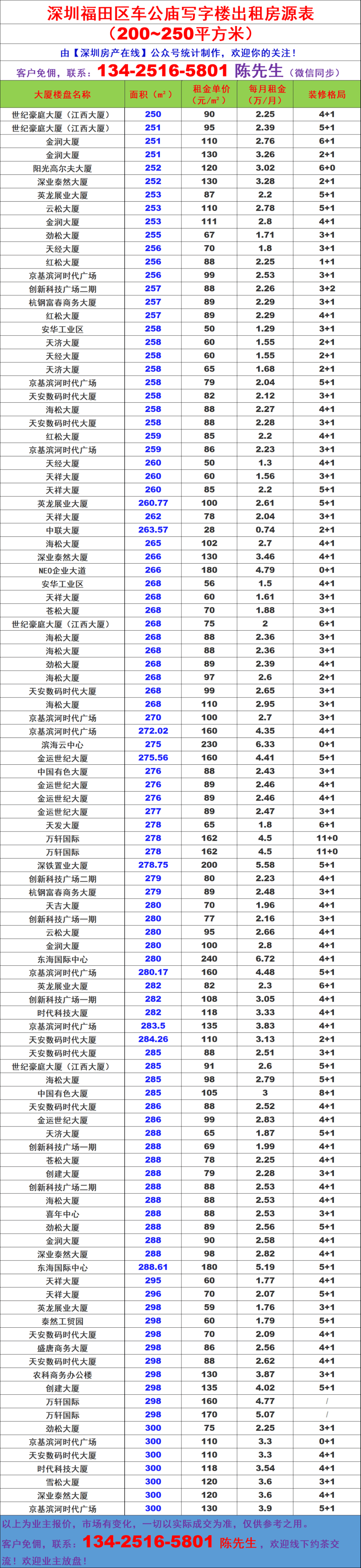 深圳福田区车公庙片区250-300平米写字楼出租招租赁信息