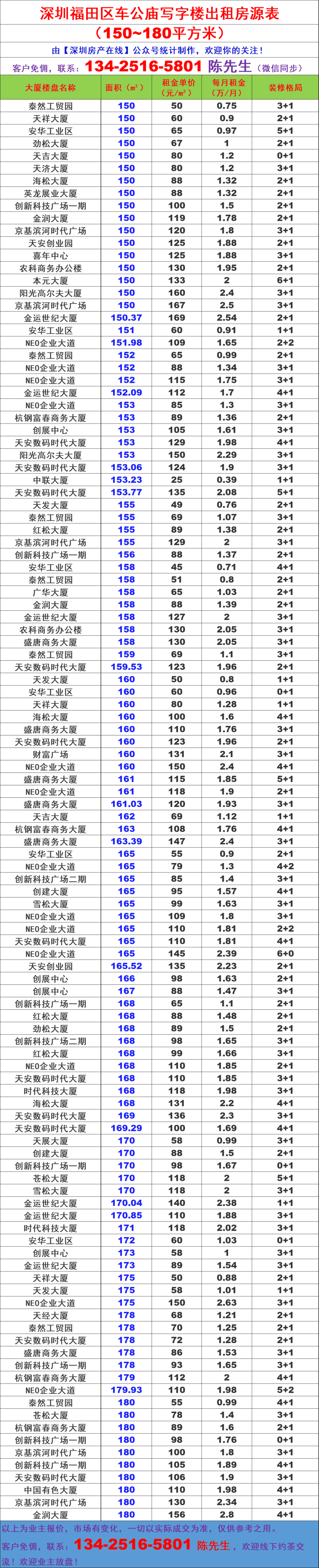 深圳福田区车公庙片区150-180平米写字楼出租招租赁信息