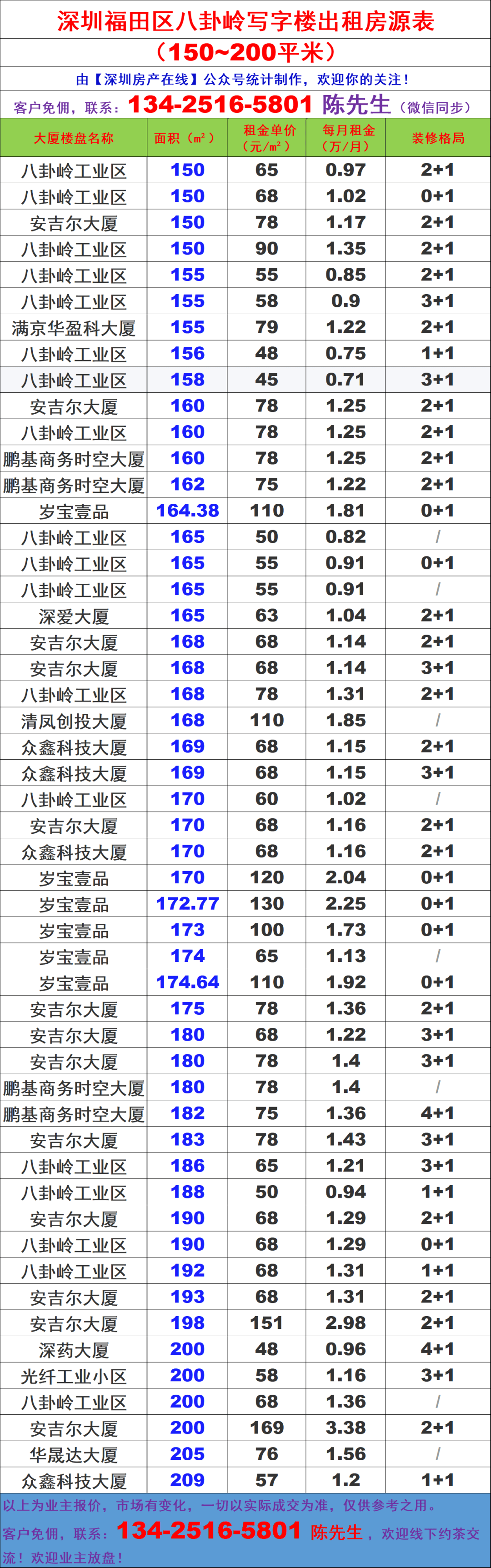 深圳福田区八卦岭片区150-200平米写字楼出租招租赁信息