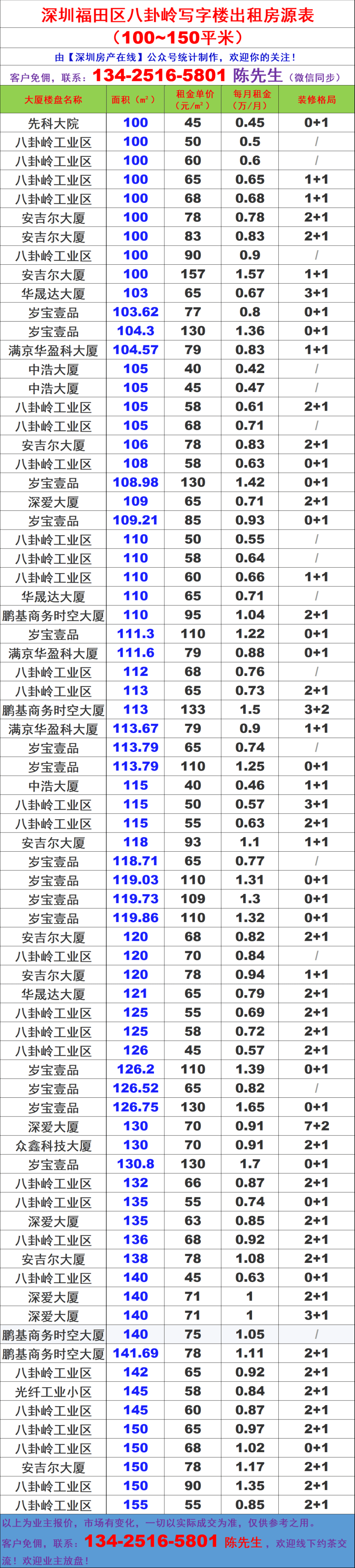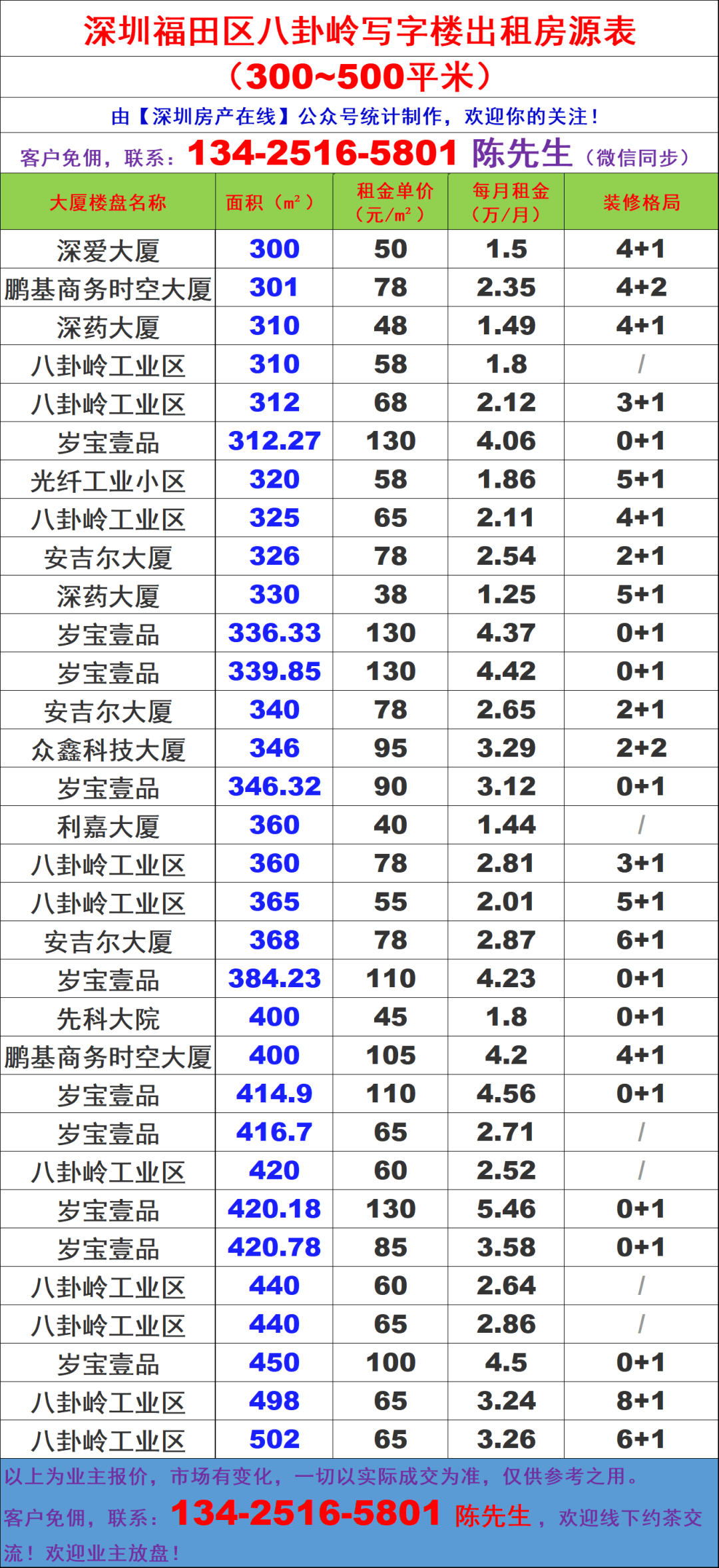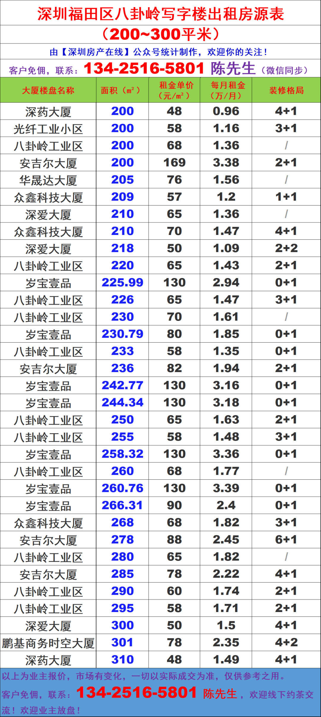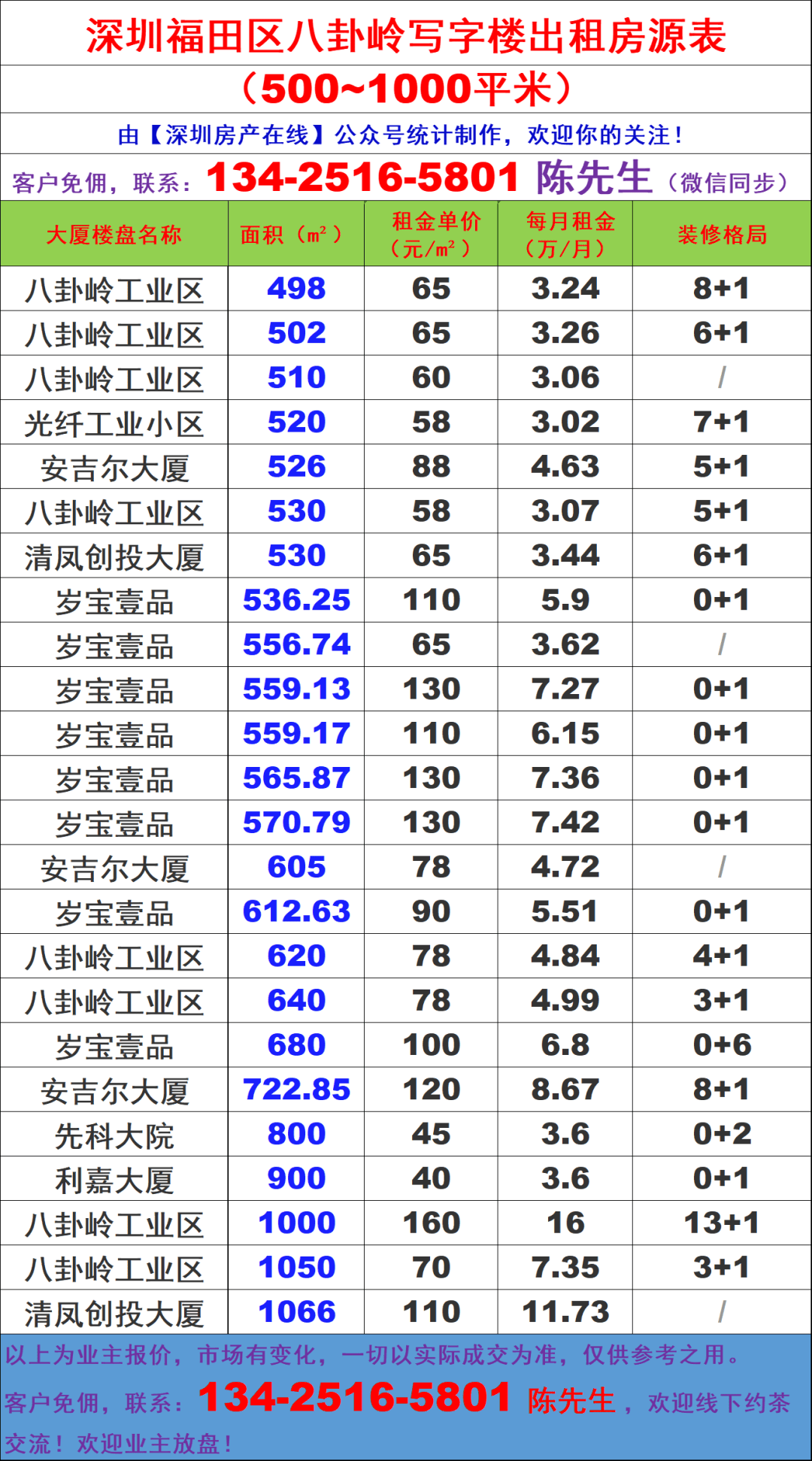 福田区八卦岭片区写字楼办公室出租房源信息表&租金价格表