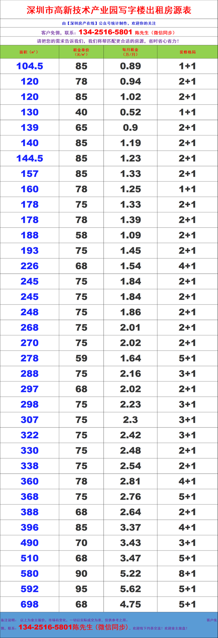南山科技园深圳市高新技术产业园写字楼租赁房源表