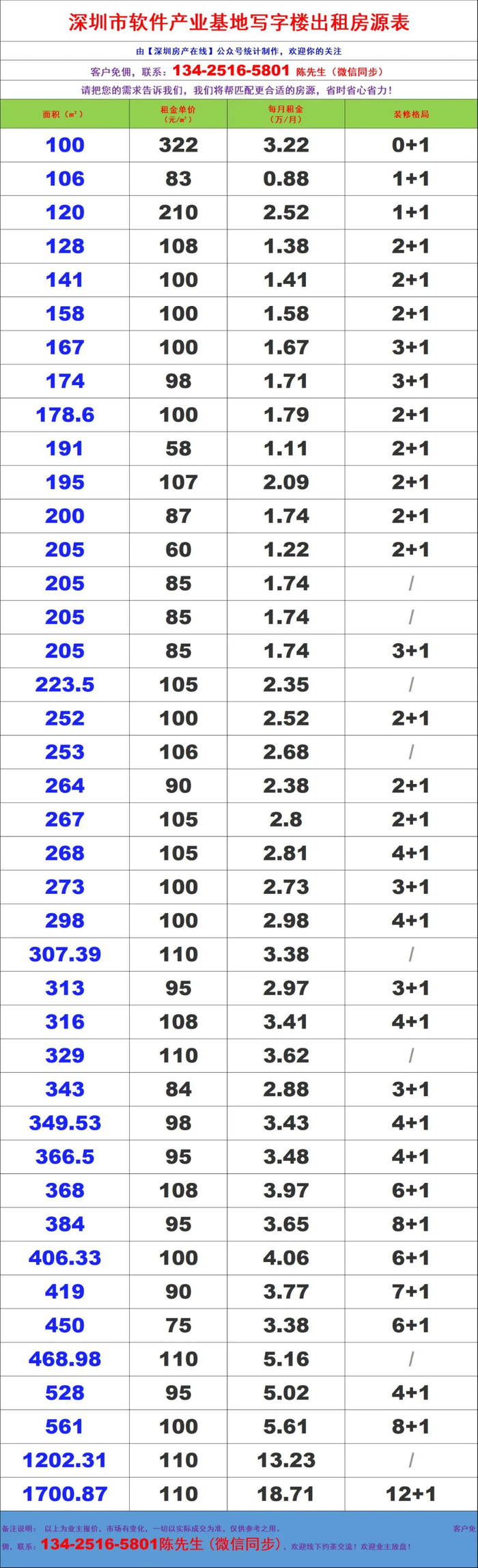 南山科技园深圳市软件产业基地写字楼租赁房源表