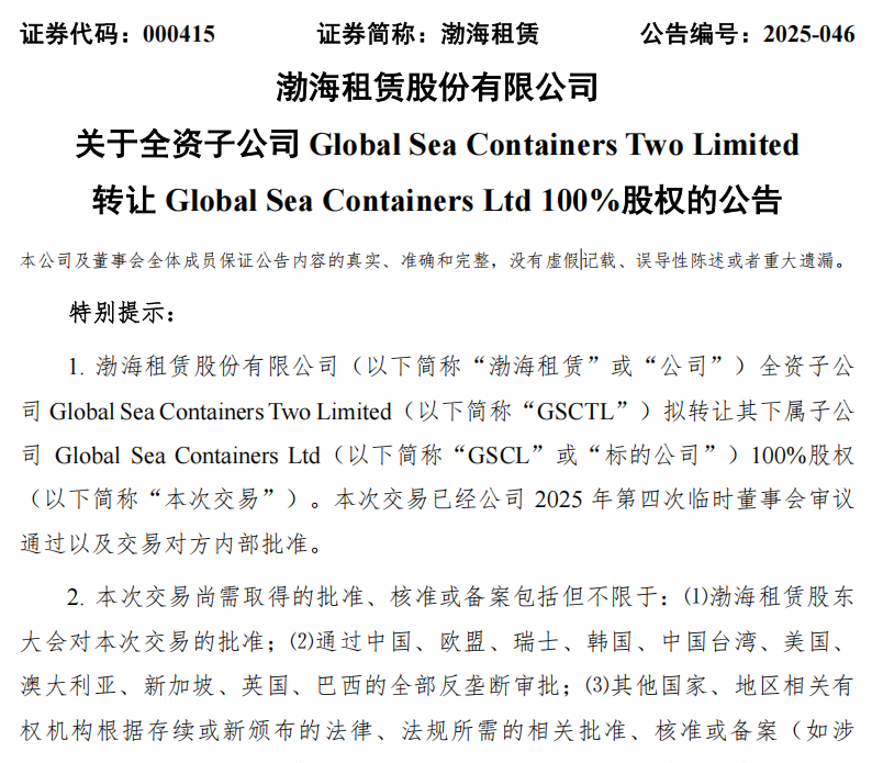 5月21日,渤海租赁(000415)公告称,其全资子公司Global Sea Containers Two Limited(GSCTL)拟以16.3亿美元(折合人民币约117.5亿元)向Stonepeak旗下投资主体Typewriter Ascend出售Global Sea Containers Ltd(GSCL)100%股权。这一交易标志着渤海租赁在控股股东海航集团破产重整余波中,正式开启战略收缩进程。