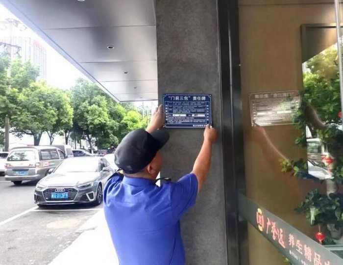 稻香村街道城管队员在辖区商业楼宇粘贴“门前三包”责任牌。