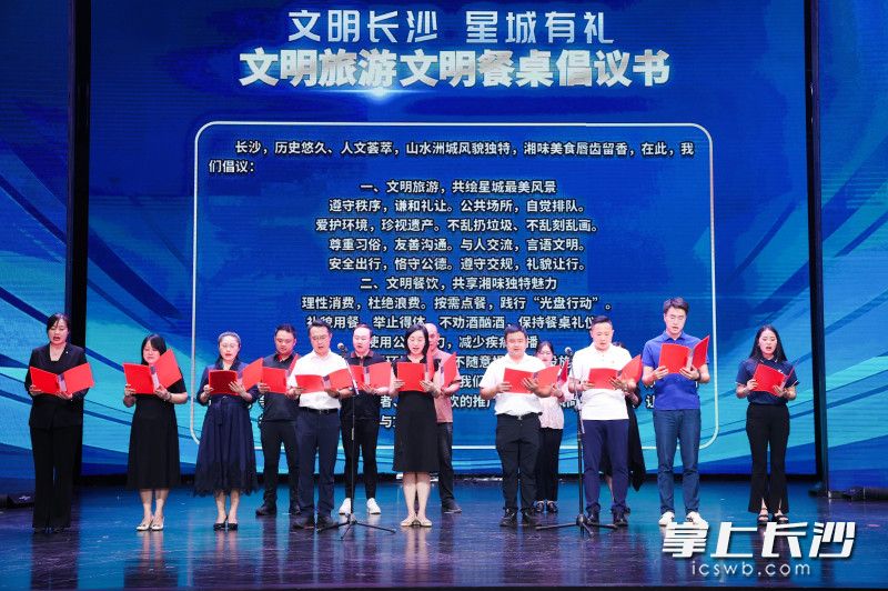 活动现场,全市文旅商家代表宣读《长沙市文旅行业文明旅游文明餐饮倡议书》,争做文明旅游的践行者、文明餐饮的推动者、文明风尚的传播者。由市民、学生、行业人员组成的长沙市文明旅游文明餐饮志愿服务队正式成立,现场为志愿服务队授旗。为了给市民游客提供更优惠、更舒心的旅游产品,现场发布“点亮星城”长沙文明旅游文明餐饮地图,该地图包含全市主要景区、知名餐饮等,融合了文明提示、文化导览与服务指南,帮助市民、游客游览更有温度、更有深度的长沙。