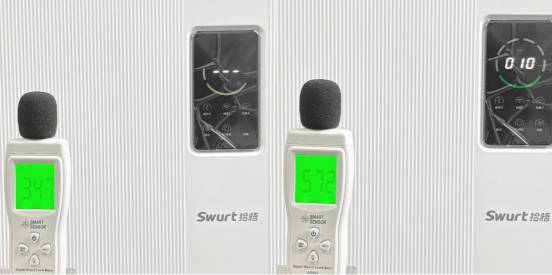 即便长时间运行,拾梧FW01的噪音也控制得当,最大档不超过57.2dB,低档模式下仅34.7dB,完全不会影响会议、办公的安静氛围。