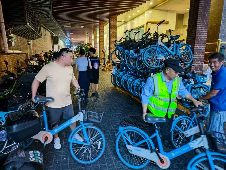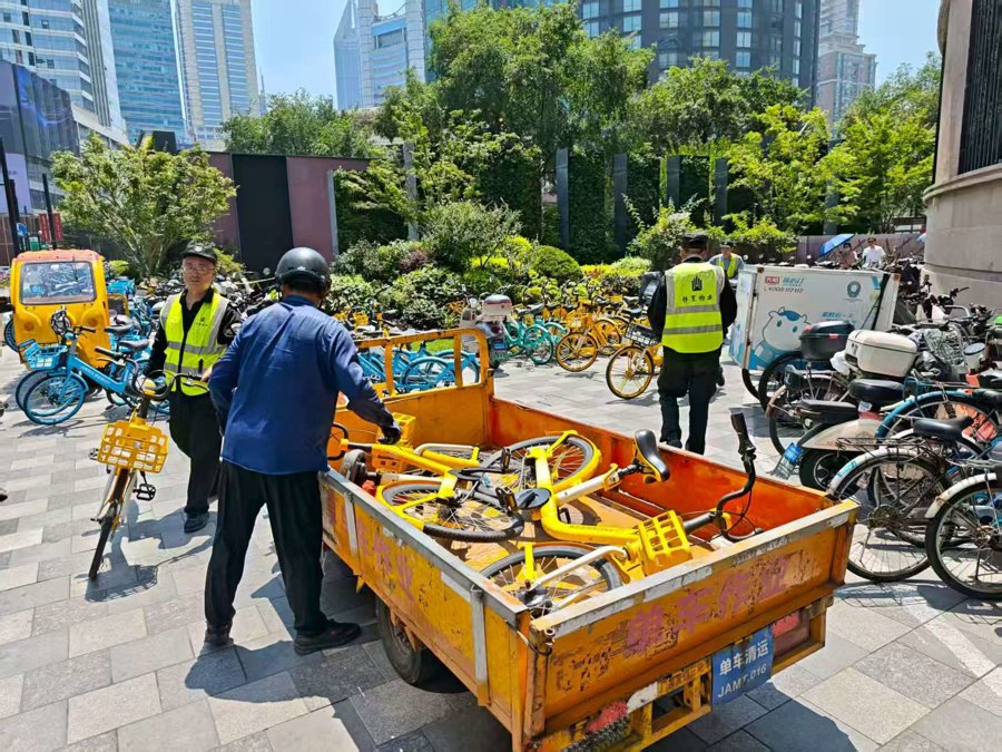 街道解企业后顾之忧 在南京西路街道城运中心办公室,大屏幕上来回切换着各条马路的实时画面。每个工作日上午9时后,各个商务楼宇周边小马路上的非机动车停放情况是城运中心工作人员重点关注的对象。在这一时段,街道聘请的环境市容情况固守队员们也会重点留意这些小马路,实地走访、巡查,看看是不是有大量共享单车积压。解决共享单车“爆仓”,共享单车投放企业要承担主要责任。在静安区相关部门帮助下,南京西路街道找到三大主要共享单车(美团、哈啰、青桔)投放企业,坐下来一起研究解决之策。大家都觉得:要加大对小马路上共享单车的清运力度。“静安区与三大共享单车企业签署过协议:遇到共享单车积压情况,企业要在5分钟内响应、20分钟内人车到场处置、1小时内完成积压单车的清运。”濮骏一告诉记者,我们一方面与共享单车企业畅通了联系渠道,一旦发现积压情况,第一时间通知三家企业处置;另一方面,督促三家企业要将“5分钟、20分钟和1个小时”的响应处置机制落实到位。但要让高频清运落到实处,先要解决共享单车企业的后顾之忧。在南京西路街道辖区内,袖珍的小马路阡陌交错,在其他宽敞街区使用的“依维柯”车型作为清运车,在这里“开不动”。街道帮助共享单车企业一起想到:使用车型更小的电动三轮车作为清运车,灵活便利。濮骏一统计过:要确保上海恒隆广场周边的共享单车停放有序,每个上午至少要动用22次三轮车,每车以清运30辆共享单车计算,相当于清走660辆共享单车。 第二个问题来了,如此大量的共享单车从商务楼宇周边清运走,要投放到哪里?“我们发现,南京西路商圈商务楼宇周边共享单车的‘爆仓’是潮汐式的。而整个南京西路商圈还存在共享单车结构性的不平衡,在其他区域、其他时点存在共享单车不足的情况。”南京西路街道城运中心负责人吴敏妍说。街道全面排摸了辖区内的道路资源,梳理出共享单车“空白点”“空白时段”,引导共享单车企业有序投放。“如,辖区内的‘巨富长’(巨鹿路、富民路、长乐路)区域,人行道较宽,停放非机动车条件好,但共享单车数量不足;距离7号线比较近的常德路有段路,走出地铁的人群有使用共享单车的需求,但那段路上经常找不到共享单车。我们在这些区域建立了共享单车停放‘蓄水池’,引导共享单车企业有序向这些区域投放。”吴敏妍说。