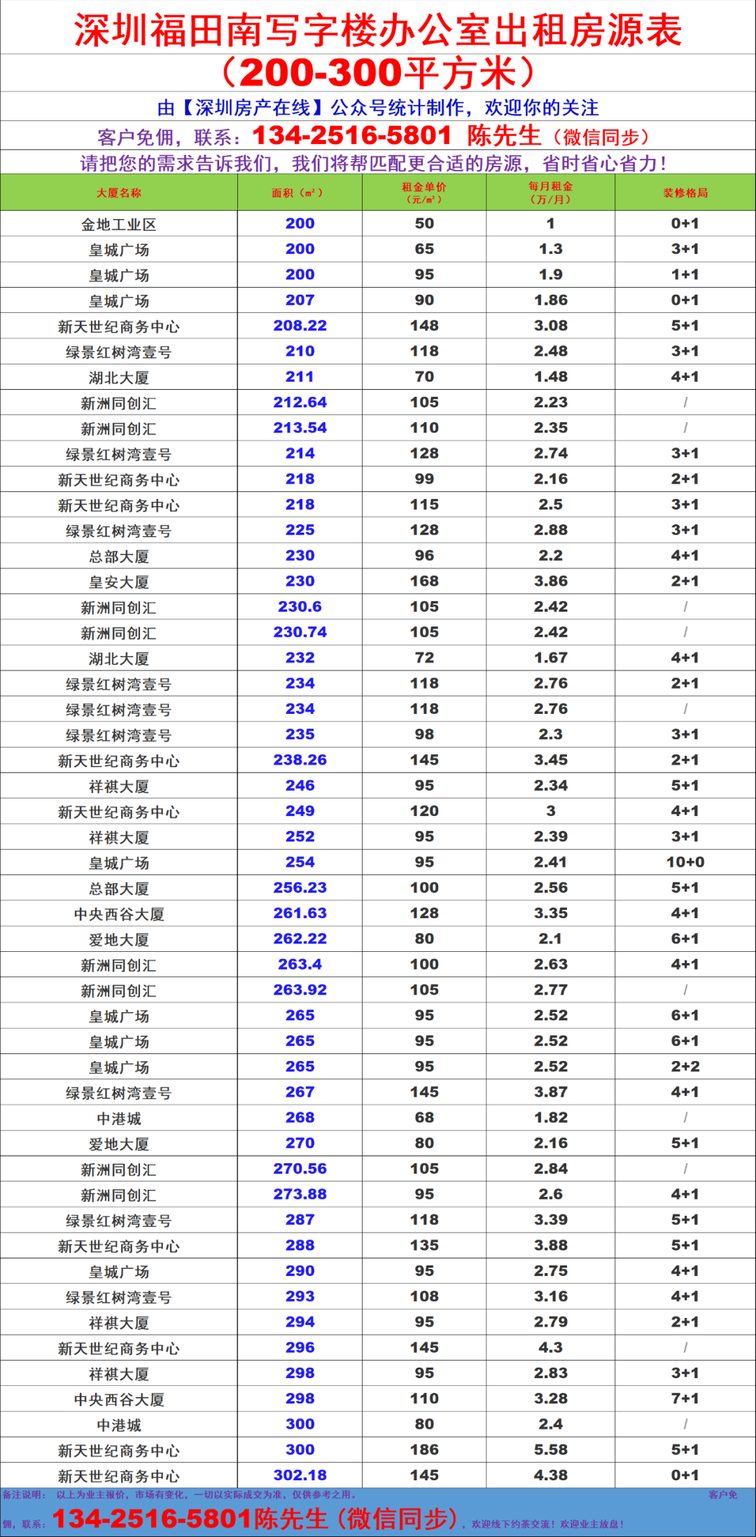 深圳福田南片区200-300平米写字楼出租招租赁信息
