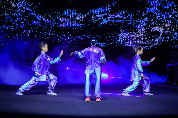 一是开场表演“太极启源”,由机器人与孩童同台演绎中国传统太极,机器人身披北京服装学院邵新艳教授团队设计的服饰,融入千禧品牌氨纶,让机器人在行云流水的太极动作中,既展现出“功夫大师” 的灵动,又凸显了千禧品牌氨纶的卓越性能——为“硅基动态金属人体”提供舒适散热与自由伸展的完美平衡,展现了其在运动防护等领域的应用潜力。而机器人与孩童的组合,更象征着科技传承与人类未来的无限可能。这不仅是一场视觉盛宴,更是一次关于未来运动方式的畅想。