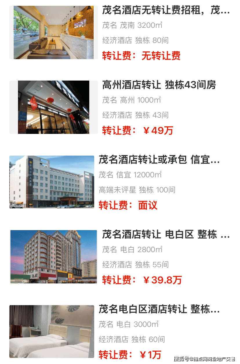 · 电白(含滨海新区):3处经济型酒店(55-60间房),月租2.35万-3.2万,转让费1万-39.8万,竞争激烈但存在低价标的(1万转让费物业)。