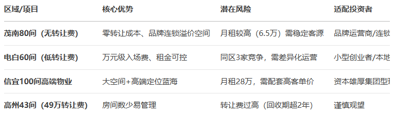 · 茂南80间房物业:无转让费+可品牌化升级,单房成本约 ¥812元/月/间(6.5万÷80),属核心区稀缺资源。